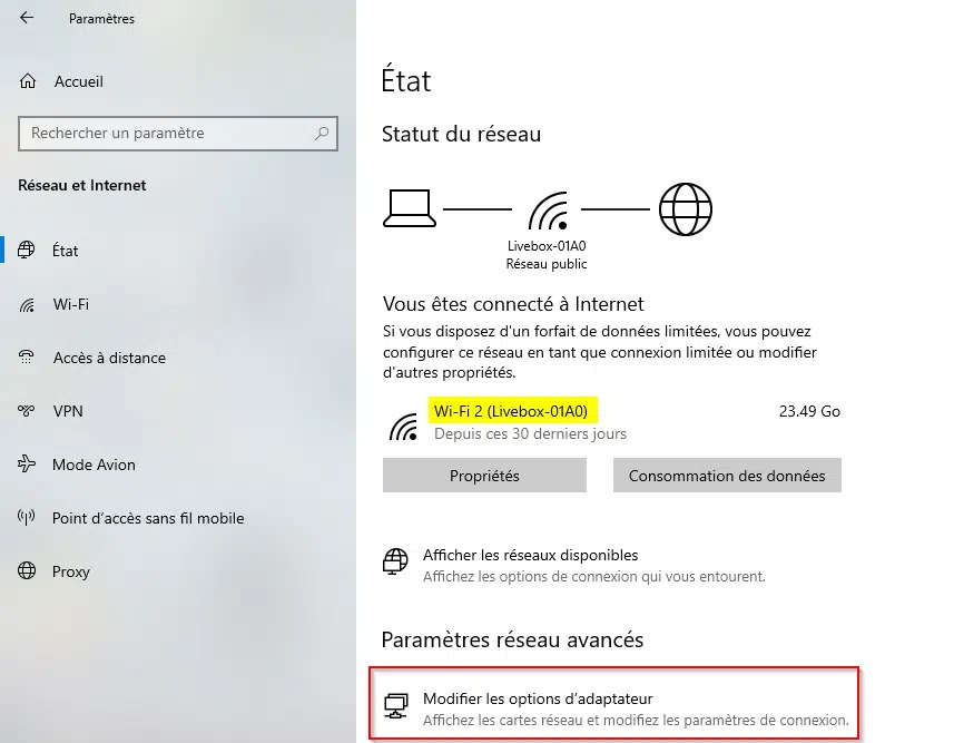 2.حدد اسم اتصال الشبكة النشط (على سبيل المثال Wi-Fi 2) ثم توجه لأسفل إلى تعديل إعدادات المحول